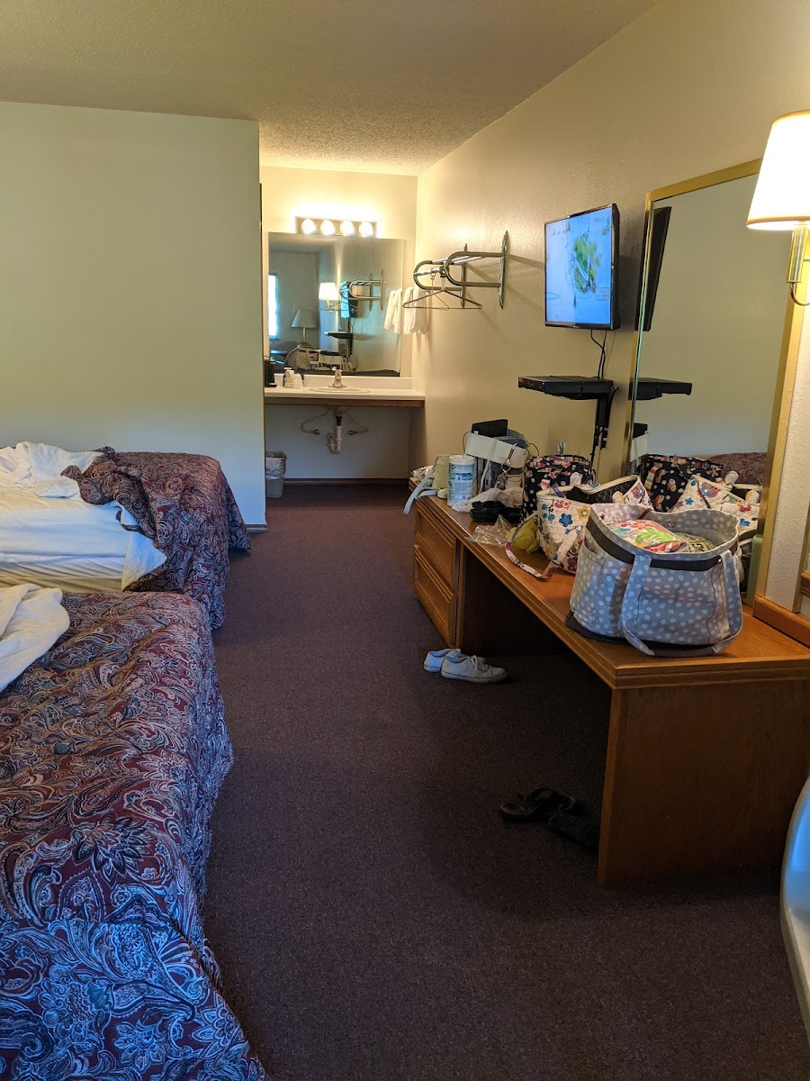 What a great find! The rooms are large, clean and very well kept. They are dated but you don’t even notice. Furniture is is excellent shape, beds comfy smells wonderful walking in. Very pleasant setting, pets welcome for $10. Large space for parking. We had a 44 gooseneck trailer had to back in but no traffic so it was simple. There is a bar and restaurant connected that has excellent food and service. Great time here will definitely stay again.